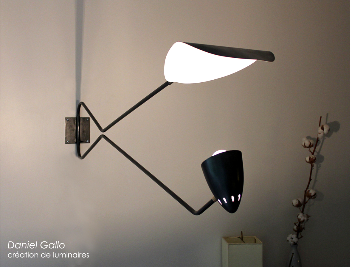 Faisons donc une place ici à la collection de luminaires du designer Daniel Gallo. Ses réalisations très graphiques, sont inspirées des années 1950 et des œuvres de Serge Mouille, Paulin, Guarriche ou encore Prouvé. Tubes aciers, laque noire et rotules laiton sont associés avec élégance. Les créations de Daniel Gallo sont distribuées par les éditions MD, 14, rue du général Hmbert, hall 15, 75014 Paris.