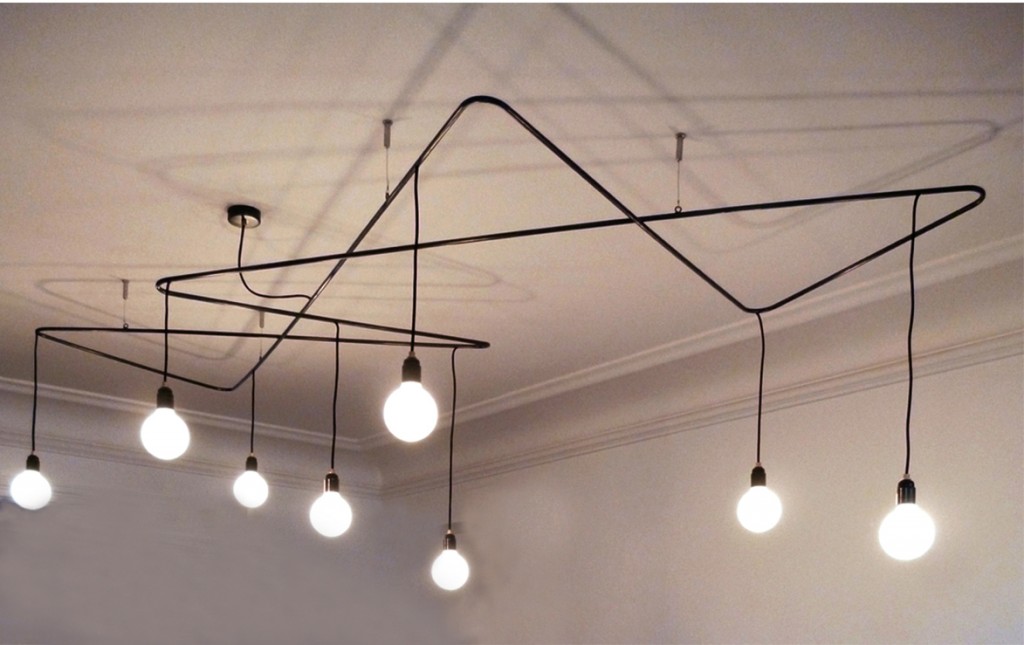 Structure en acier cintré, laqué noir, suspendue au plafond par 4 filins d’acier permettant le règlage de la distance souhaitée. Eclairage par 8 ampoules halogène de 40 ou 60 W logées dans 8 globes en verre blanc mat de 10 cm de diamêtre. choix de la hauteur de chaque globe en fonction des demandes. Câbles noir en tissu. Longueur 250 cm, plus grande largeur 160 cm.Hauteur : du plafond au globe le plus bas env. 100 cm.